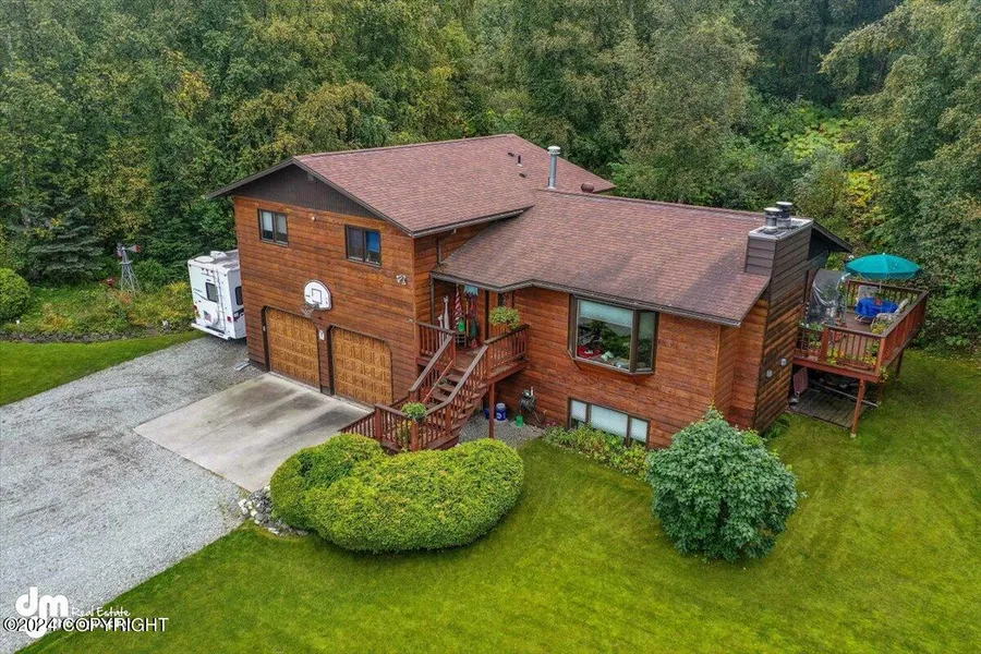 1.47 acres of peaceful living conveniently located near JBER, 13 miles from Anchorage, and 3 miles from Eagle River. Meticulously maintained and clean. Private forested property with paths, a brook nearby, and a peaceful pond. Unwind on the wrap around deck, covered porch, rec room, or by the fire. Partial inlet & mountain views. Newer roof, new furnace & septic. More info in supplement. 1.47 acres of peaceful living conveniently located near JBER, 13 miles from Anchorage, and 3 miles from Eagle River. Private forested property with paths, a babbling brook nearby, and a peaceful pond in your front yard. Unwind on the wrap around deck, covered porch, rec room, or by the fire. Partial inlet & mountain views. Newer roof, new furnace & septic. Safe/Gun Room. More info in supplement New Septic system - Spring 2024 New Furnace - 2022 with 10 Year Warranty Upgraded Well - New pump and protection switch. Newer Roof - 7-8 Years old with 30 year shingles. Kitchen counters and flooring updated in 2021. New laundry floor in 2020. 450 sq ft of deck. RV Parking Shed for lawn mower and toys. Safe/Gun Room. Remote control waterfall and pond. Trails mowed throughout property. ***Septic was recently replaced and the grass has been planted. The septic is located within the flower bed near the garage.