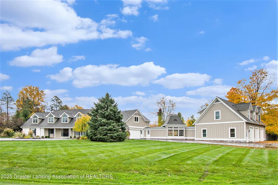 Endless possibilities with this magnificent home with pond views out back and a peaceful pasture in front. Over 6,400 sq.ft. is available to create your ideal spaces. The eat-in kitchen features high-end appliances and overlooks the stone fireplace in the great room. A slider accesses the inground pool, hot tub, water-fall feature, and firepit. 1st floor rooms include the primary suite with 3 adjoining rooms, office, laundry rm and living room with fireplace. The 2nd floor studio includes skylights, utility sink, bdrm and full bath for an au pair, school room, or your own ample project space. A pub-like bar is a special feature in the basement. Beyond the 2-car attached garage is a breezeway running to the 3-stall garage with 8.8' overhead garage doors and mother inlaw apartment above.