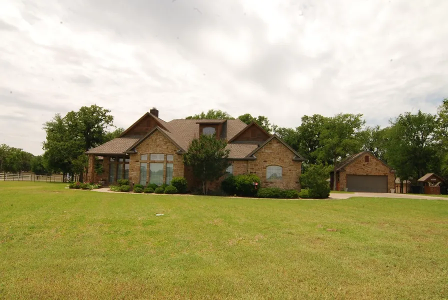 Stunning family home on 1+ acres. House features open living area, lots of windows, crown molding throughout, arched doorways, wood floors. Spacious kitchen with custom cabinets, granite counters, stainless steel appliances, and gas cooktop. Enjoy outdoor entertaining in a park like setting with outdoor kitchen, overlooking a beautiful pond. Additional detached 2 car garage, makes covered parking for 4. Well for sprinkler system for entire lawn.