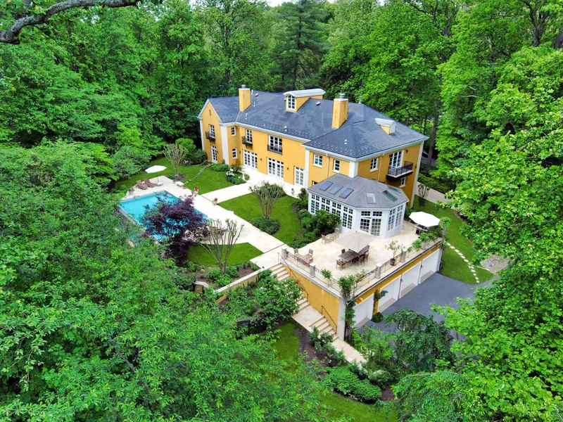 Bradley Hills Grove is unquestionably one of the finest residential communities in the country, its rolling hills dotted with some of the finest estates in the Capital Region. Within this pocket of prestige, perched high above the street on one and a half wooded acres, 8814 Chalon Drive belongs to a class of distinguished residences rarely available on the market. Upon ascending the driveway through lighted entry pillars, one is greeted by a striking yellow stucco facade adorned with wrought iron balconies, arched windows and contrasting quoins elements borrowed from classic European architecture. Stepping into the soaring marble reception area, light emanates from windows above while the rear lawn can be seen through double glass doors. Over 10,800 square feet of immaculate living space is introduced, with all major rooms flowing effortlessly from the foyer, such as the embassy-sized formal living room which spans the entire depth of the home and boasts a wood burning fireplace adjacent to double doors accessing the outdoors. Likewise, the formal dining room is banquet-sized, featuring its own fireplace enhancing the minimalist, tasteful ambiance. The chefs kitchen ought to be any home cooks dream, with commercial-grade appliances nestled in cream colored, furniture-grade cabinets. Stunning limestone floors laid out in a Versailles pattern tie everything together, while the family room with wood burning fireplace provides an elegantly intimate informal gathering space. Completing the main level are a large office space lined with custom mahogany built-ins featuring its own fireplace and wet bar, as well as a gracious solarium. Ascending the spiral staircase reveals an ethereal upper level sitting area with built-in bookcases. The owners retreat features a private balcony seemingly floating in the woods, while an oversized walk-in closet and spa-inspired bath with separate vanities as well as a jacuzzi tub makes it a true oasis. Four additional bedrooms on the upper level two ensuite with walk-in closets and two sharing a jack-and-jill bath, offer spacious, ample accommodation. At the base of the grand staircase, the lower level boasts soaring ceiling heights and is an entertainers dream with a separate bar and wine cellar. A private fitness center is also found on this level. Out back, the limestone patio serves as the basis of an extensive hardscaping package complementing the full and lush landscaping. An incredible lap pool serves as the centerpiece of the homes outdoor areas, its infinity edge extending into the treeline. Quality and attention to detail are evident in every square inch of the residence, from the synthetic slate roof to a thoughtfully-designed build out space for an elevator. The location is unparalleled, mere minutes from The Beltway, Downtown Bethesda, Northern Virginia, and the city. Blending convenience with an extensive list of amenities, not to mention sited on one of the largest lots in one of the finest residential neighborhoods in the nation, 8814 Chalon Drive is a truly special home through and through.