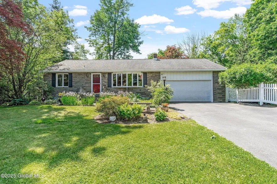 Charming and private, this beautifully landscaped stone-front ranch offers peaceful living surrounded by lush gardens, mature trees, and a tranquil creek. Enjoy outdoor relaxation on the elevated deck with modern cable rail or the cozy all-seasons back porch with hot tub. Inside, you'll find built-in kitchen cabinetry, two spacious main bedrooms, a full bath with laundry, and a sun-filled living room with a fireplace. Bonus features include a walk-up attic above the garage, basement access via the garage, and a lovely setting perfect for year-round enjoyment. A true retreat minutes from everything!
