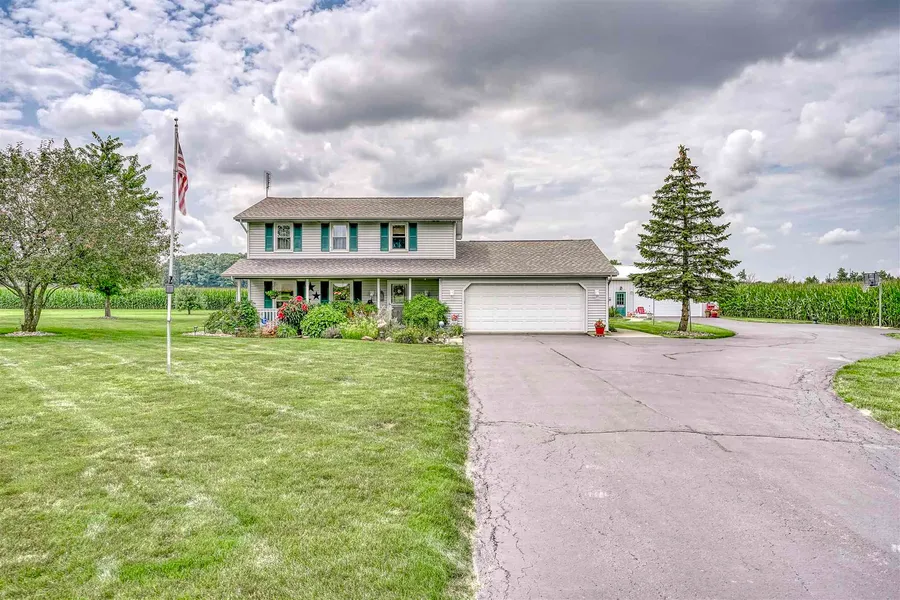 COBU,accepting back up offers. Wonderful four bedroom two story home located on 1.5 acres with a 30 x 60 pole (10' ceiling height) building with a 11 x 31 lean to right behind the pole barn. 19 x 14 covered porch. Zoned A-1. Pole barn has concrete floors, a horse stable, garage door with openers, separate office area, water, drain electricity and LED strip lighting. Duct work and electrical and thermostat for a future heating source. Possible to connect to city water and sewer. All electric home, budget $131 mo. Roof replaced in 2012, well pump 2021, pressure tank 2021, Carrier Heating/Cooling system - Mini Splits 2018 (no need to use the electric ceiling heat), New carpet in upstairs bedrooms, hall and steps. Living room carpet 2005, septic pumped in 2020, water heater 2019, drain tiles in front yard 2003. Asphalt driveway recoated in 2018. Ceiling fans in most of the rooms. All appliances remain even the washer and dryer. The Boss water softener remains. Green cabinets and work bench remain in the garage. 100 amp service in the outbuilding and 200 amp service in the home.