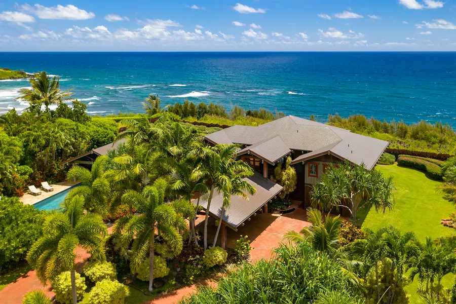 Spectacular Aliomanu Estates Bluff Home with captivating white water views to the north and coastline views to the east. Lovely Kalalea Mountain range and "Kong" views from the lanai. This private, gated estate boasts an open floor plan and countless upgrades including Douglas fir floors, copper shingled roof, concrete counter tops and many other custom features. In addition to over 4,200 sq ft of interior living space there is over 1000 sqft of lanai space. Separate Pool house with over-sized pool, spa and plenty of space to dine or lounge poolside. With a total of 5 bedrooms (each with an ocean view!), 4.5 baths and multiple living/gather spaces both indoor and out, this estate's layout works well for a family compound. Once you enter this pristine paradise you won't want to leave! Follow the palm lined concrete driveway through the custom gate to the elegant 760 sf porte cochere entry. This private estate is ideally located just steps from two amazing sandy beaches (Papa'a and Aliomanu) with a breathtaking view of Papa'a Bay.