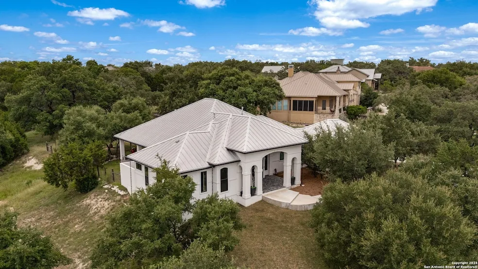 Imagine coming home to 1.5 acres of Hill Country beauty-where the land feels wild and private, yet the upkeep is refreshingly simple. Set within the prestigious gated community of Menger Springs, this modern Hill Country-style home offers a rare combination of seclusion, elegance, and convenience. Surrounded by mature trees and untouched natural landscape, it feels like a private retreat-yet you're only minutes from downtown Boerne's shopping, dining, and quick access to I-10. The thoughtfully designed, single-level floor plan is fully accessible, with each bedroom featuring its own en suite bath, creating comfort and privacy for family and guests. The 1.5-acre lot is designed to maximize privacy without the burden of heavy maintenance. A smaller, manicured lawn is perfect for daily living and entertaining, while the surrounding landscape stays natural and easy-care. There's also room for your dreams-whether that's adding a sparkling backyard pool, building a workshop, or creating extra storage space. From the open living areas, custom kitchen built for entertaining and spa-like primary suite to the covered patio that invites quiet evenings under the stars, this home captures the perfect balance of modern style and Hill Country charm. This isn't just a home-it's your private Hill Country sanctuary, ready for your next chapter.