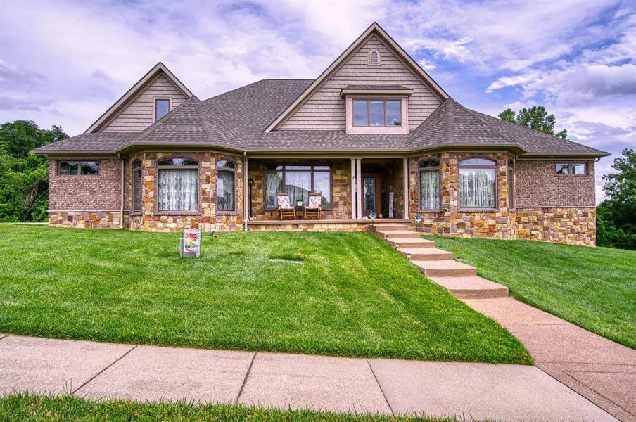 Start Showing Date: 6/5/2022 Impressive custom built home by John Mattingly with great views of the Ohio River near downtown Newburgh. Directly downhill is the RiverWalk leading to the restaurants and shops. This home is situated on 1.5 acres on a cul-de-sac and at a higher elevation. From the moment you enter you will see and feel the first-class quality. To the right is a home office or den and to your left is a formal dining room with 3/4ths of the wall striking wood wainscoting. From the dining room is another office, den or sitting room. The spacious French Country kitchen has an abundance of stunning cabinetry, granite countertops, and an island with seating capacity for up to 6-7 bar stools and a breakfast area. The kitchen is open to the amazing great room featuring dramatic vaulted wood beam ceilings, full wall stone see through fireplace, lots of large windows with transoms for plenty of natural light and lovely distressed Acacia hardwood flooring throughout. Extra large 3 seasons screened-in porch off the great room and Owner's suite perfect for family gatherings and curling up to the fireplace with peaceful views of the river.. The main level Owner's suite has tray ceilings with double doors leading to the screened-in porch with a huge custom closet. The Owner's suite bathroom features separate his and her French Country vanities with additional storage, tiled shower and wainscoting, with a spa tub to relax in after a long day. The second main level bedroom is as large as the Owner's suite and has a full bath with roll-in shower with a walk-in closet that also serves as a storm shelter. There is a guest suite on the second level with a full bath with a private getaway feel. The second level also features a gigantic attic space with a large window allowing you to possibly construct a 4th bedroom/Bonus Room if desired. The gas HVAC and fireplace (maintained annually), tankless "on demand" water heater, and sprinkler system installed in 2020 are in optimal working order. This home has zero step entrance and designed as ADA compliant to "Age in Place". Don't miss this rare opportunity to own such a unique custom home with beautiful river views in the heart of Newburgh.
