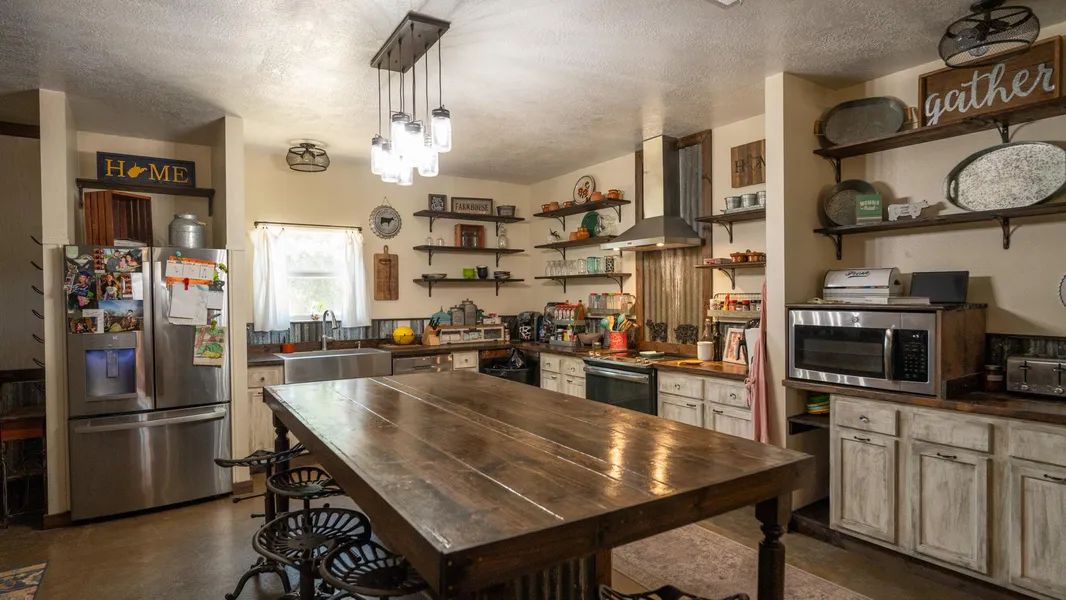 A custom home sits near the eastern edge of the property and is approximately 3,200 square feet, featuring a farmhouse feel from its stained concrete floors to an open living and kitchen area. The home has 4 bedrooms and 2.5 baths along with a large utility room and game room area for family and guests to enjoy. The home has a metal roof in place and Hardie siding. The outside of the home features a large, covered porch and additional storage spaces.