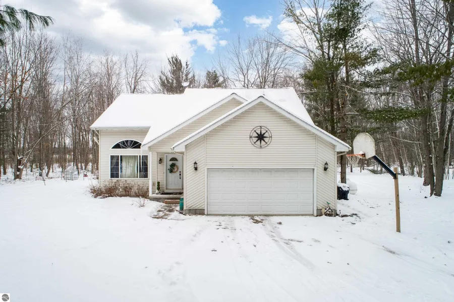 Escape to privacy & comfort in this beautiful contemporary home set on 1.7 wooded acres in a highly desirable neighborhood. Offering a peaceful, secluded feel, this property is centrally located between Midland, Mt. Pleasant & Clare, just minutes from US-10—ideal for buyers who want a rural setting with quick, convenient commutes. The home features 4 generously sized bedrooms (2 main floor bedrooms) & large, open living spaces filled with natural light. A stunning vaulted ceiling in the living room creates an impressive first impression the moment you step inside. Pride of ownership shows throughout with recent updates including a remodeled upstairs bath & laundry, new flooring & paint in select areas, plus updated light fixtures & ceiling fans. Enjoy energy efficiency with an outdoor wood furnace system capable of heating the entire home—helping reduce utility costs. The backyard offers a true park-like setting, beautifully landscaped with a bonfire area, garden with dedicated water hookup, & multiple outbuildings to meet all your storage or hobby needs. This property blends space, privacy & convenience in a sought-after location—perfect for buyers seeking a serene lifestyle without sacrificing accessibility. A rare opportunity you won’t want to miss!