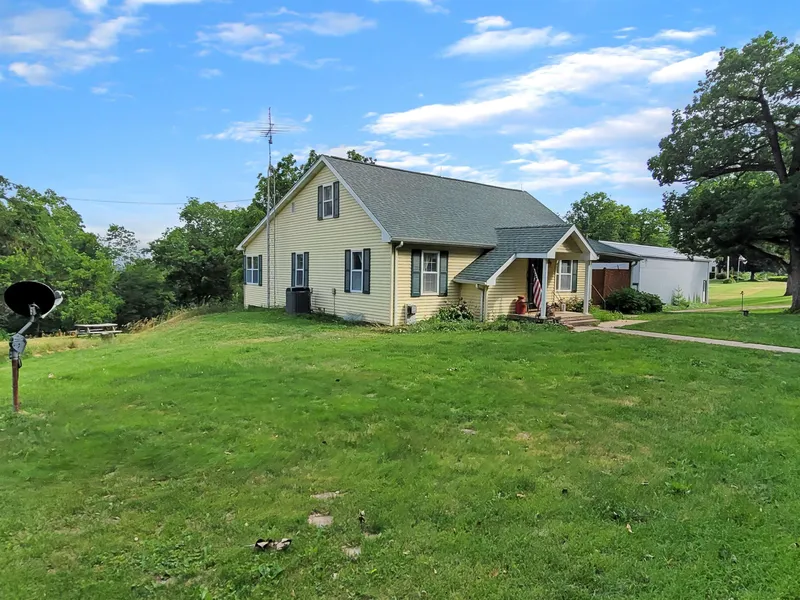 Charming country retreat sited on 1.65 acres featuring gorgeous seasonal treed views of the valley below, huge 50" x 22' pole building, additional shed for storage/workshop/garden, two car tandem under garage, and a great location halfway between Galena and Scales Mound offering convenience to either. Airy main level houses generous kitchen with loads of cherry cabinetry, large eat-at counter, access to huge, covered deck, and an additional breakfast nook with work desk and laundry area, light filled living room with room to relax and lots of windows to take in the views, large formal dining room with wood floors and ample space for guests, main level master bedroom with ceiling fan, wood floors, and access to bathroom, and additional cozy guest bedroom. Expansive upper-level bedroom spans the length of the house and has room for sitting area and multiple closets. Head to the lower level...