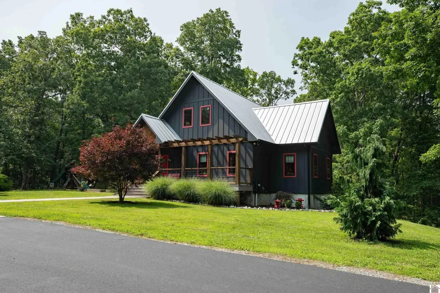 Custom-built home designed for privacy and stylish living. Tucked into 12.64 acres of enchanted woods just 2 miles from Kentucky Lake. Homestead adventures for mushrooming, hunting, hiking, bird watching and other wildlife sightings. Built for entertaining with multiple living spaces on three levels. Features 3 BR/3 bath with open concept floor plan and eclectic artistic finishes, hickory wood floors, screened porch, covered back and front porches, and patio. Primary suite is pure delight with large walk-in closet and bath area offering unique double sinks from an old barber shop. Impressive staircase leads upstairs to large bonus area and secondary bedrooms. The walk-out basement offers flex space for relaxed gatherings, kitchenette and full bath, large office space and additional bedrooms. Solar shades in most rooms. Over the top construction with attention to details and quali...
