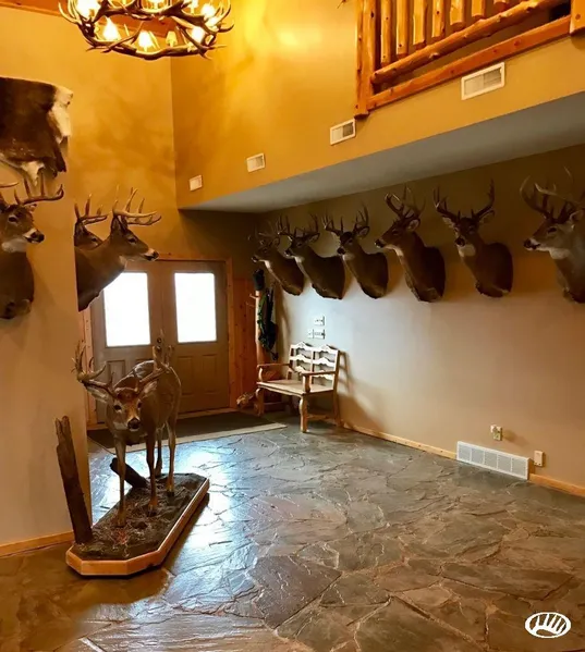 This is an amazing property consisting of old growth forest, tillable cropland, food plots, its own lake (Mud Lake) and a man-made canal to the lake. The property is huge, with low ground in the middle of the property and fingers and islands of high ground around the property. The property has a couple of access points, and several areas of the property have yet to be explored. The property has a gorgeous home with 6,000 square feet of living space. It has an attached garaged and a 40' x 60' detached garage or workshop. The shop has in floor heat and has 2 x 6 construction. The 3-level house also has 2 x 6 construction with a basement, a main level and an upstairs level. Part of the basement includes the attached 35' x 40' garage. The basement also has two bedrooms and a full kitchen, dining room and living room. This level could be rented out or it might make a perfect mother in law suite. The main level of the home includes the great room that has vaulted ceilings that are 28 feet from the floor to the peak. The stone fireplace from floor to ceiling enhances the look of the log beams and log railings and steps. The great room is 35' x 40' giving you plenty of room to store your trophies. The main level also has an office, the kitchen and dining room, a bathroom, laundry room and one bedroom. The office could also be converted to a bedroom. The upstairs level has the master bedroom, which includes the master bath and a huge walk-in closet. The master bedroom also features a sliding glass door out to a honeymoon deck. This level also has two additional bedrooms and a bathroom. The property has been developed for whitetail deer hunting and numerous trophy bucks have been taken off the property over the years. The property is about 14 miles east of Camp Ripley. (All of the whitetail bucks in the pictures were taken from this property - there are no guarantees that you will have the same success, but this property has produced some outstanding trophy whitetails over time). There are several miles of well-established and well-groomed trails and several established food plot areas to hunt over. The property would also make a great duck hunting property. In the middle of the property is the 30-acre Mud Lake. Mud Lake is easy to get to by using the man-made canal on your very own airboat. (The airboat comes with the property). The current owner has had great success fishing on his own private lake. Or you could plant some wild rice to attract more ducks. The property is about 12 minutes from Pierz, 18 minutes from Onamia, and only 21 minutes to the west shore of Mille Lacs Lake. The property is very close to other area lakes as well, including Sullivan Lake and Platte Lake to the North. Sullivan has high numbers of northern pike and black crappies. Platte Lake also has a high number of crappies and both lakes have walleyes and yellow perch. Both lakes also have DNR access ramps and are connected by a channel. You can hunt whitetail deer, black bear, turkeys, grouse, ducks and geese on the property. There are many other recreational activities to do in the area, including fishing, snowmobiling and 4-wheeling on area trails. If you like to gamble, the Grand Casino Mille Lacs is about 25 minutes away. You have to see this property to appreciate its grandeur!