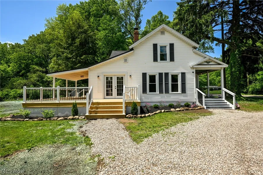 STUNNING! Gorgeous, fully renovated Gable Front + Wing Farmhouse on a fabulous 1.5 acre lot w/ private pond, a huge Barn style 2 car garage with metal siding + metal roof + additional storage, horseshoe driveway and a marvelous newly built wrap around deck with awning! Everything to do with this home has been fully updated/renovated! The main level offers a charming living room with woodburning fireplace, a dining room or multipurpose room/possible office with beamed ceiling, a first floor primary bedroom w/ private half bath and a gorgeous expanded + fully renovated kitchen with walk in pantry closet! The second level offers two nice sized bedrooms with fully refinished hardwood floors, a newly constructed 2nd floor laundry room, + a fabulously remodeled full bathroom with stylish sliding barn door! Updates include: laminate in living room, dining room, stairs + Upper level- newer roof,...