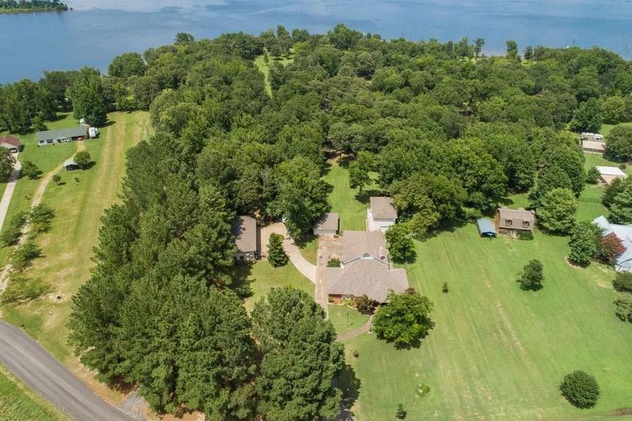 Truly Custom Estate on Lake Fork with 1.5 acres deeded land and an outstanding 12+ acre leaseback. This home could be a sprawling private residence or perfect for generational living! The spacious main level of the home boasts 3 bedrooms (one currently used as game room), 2 full baths and an elegant living room with beautiful stacked stone fireplace and formal dining area. The kitchen has custom beveled granite, gorgeous maple cabinets and stainless appliances. You can sit at the breakfast bar or enjoy the large center island in this fabulous kitchen. There is a laundry room and huge pantry off the kitchen so you will never be lacking in storage. Upstairs the second living space has cozy living area and a large bedroom. Currently it's being used as a private master suite. It has a kitchenette, office nook & French doors leading to the deck. The master bath features dual sinks, separate garden tub & steam shower, a bidet in the water closet and 3 spacious closets! There is a 2 story guest house that has an open floorplan, full bath & full kitchen, and down below the fabulous craft room & workshop with half bath. The 41x27 shop has 3 bays, car lift & private office with half bath & laundry. There is also a traditional 32x24 2 car garage with pull through. Once outside the grounds do not disappoint! First thing you see is the custom brick mural on the front of the home by famous artist Paula Collins (Google her!) Out back you have a screened porch, spa and an outdoor shower. There is a stained & stamped concrete covered porch with fans, TV that is ideal for entertaining. Follow the path toward the water and you will find an orchard with apple, pecan and many other fruit trees in addition to a large area designated for the vegetable garden which is all irrigated. On the leaseback there is a 720 square foot boat shed that will fit your pontoon or other toys. At the lake there is the covered boat dock with 2 lifts and stunning views of the world famous Lake Fork!