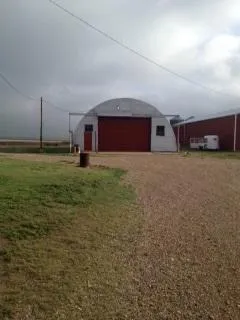 b.A 40X100 Quonset barn with concrete floor and an electric powered roll-up door.