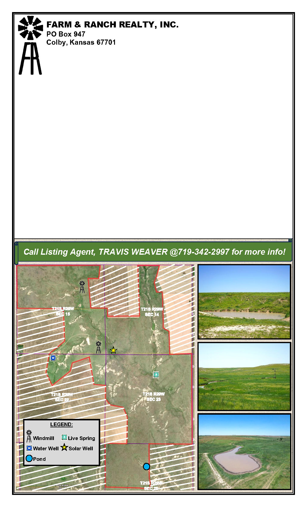 1,525 acres of well-maintained grassland for sale in Finney County, Kansas. This excellent grazing property includes corrals, water wells, and water tanks, all of which are included in the sale. Possession will be granted at closing, subject to the current tenant's right to graze through the 2025 grazing season, ending October 1, 2025. A survey will be provided at the seller's expense prior to closing. Fifty percent of the seller's owned mineral interest will transfer to the buyer at closing, along with any wind lease interest of record. Real estate taxes for 2025 will be prorated to the date of closing; 2024 taxes were $2,104.12 and include additional tracts not included in the sale-final amounts will be split accordingly. Signs will be posted on-site for easy identification. For more information, contact listing agent, Travis Weaver, at 719-342-2997 or Farm & Ranch Realty, Inc. at 1-80...