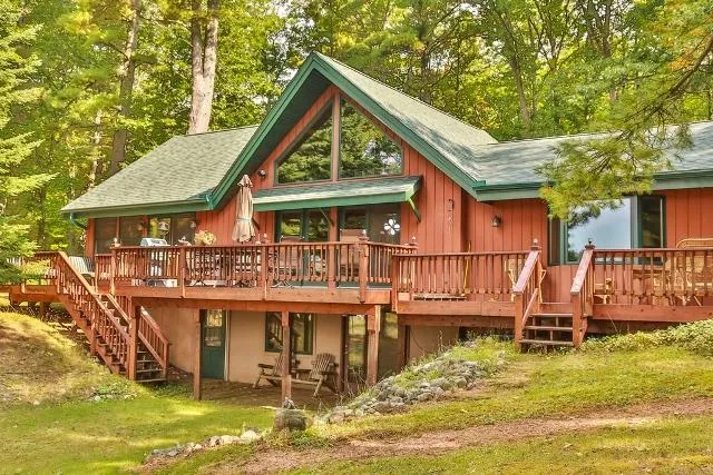 Immaculate Interlocken Woods Home on pristine East Twin Lake on the Quiet Side of the N'Woods! Truly charming 1.5 story home is beautifully maintained & extensively updated. Peaceful and tranquil setting on 1.5 acres of wooded land, with 150' of shoreline & the priceless Southwest exposure on private East Twin Lake. The living room features a vaulted ceiling, fieldstone WB fireplace & lake views. The lovely dining room leads into the eat-in kitchen with granite counters & ash floors. Convenient loft area! The master suite is a delight with a walk-in closet & a stunning bathroom, including twin sinks, whirlpool tub & walk-in tile shower. Lakeside sun room with vaulted ceiling, currently mstr bdrm. The finished walkout lower level features two add'l bdrms, a full bathroom & util area. Spacious lakeside deck, professionally landscaped, firepit, shed, privacy & level shoreline! Ownership in 700 AC Interlocken Woods, providing private access to Bear Lk!