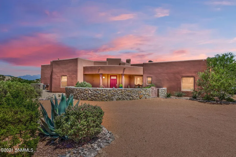 Beautifully appointed contemporary south western style property. Unique in its distinction and design and constructed by a local builder, this home features a secluded courtyard entry that leads into a spacious Great Room with a Specialty fireplace, Beams and Gorgeous Views of the mountains and the city lights. The Owners Suite is spacious with an extra large walk-in closet, lovely bath, with a free standing garden tub, separate vanities with granite and undermount sinks, and a separate door leads to an enclosed hot tub area that will remain with the property. The three additional bedrooms are large and one features a walk in closet. The outdoor living area is exceptional with a Fireplace, TV, and cozy sitting area which opens to a large wrap around porch. Amenities abound in this extraordinary home and must be seen to be appreciated.