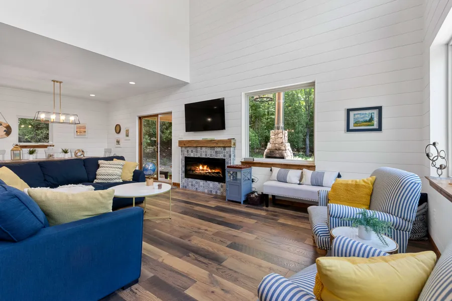 Nestled in a beautiful wooded cul de sac is this extraordinary cottage which sits on 1.54 acres and is a short walk to Egg Harbor Beach, shopping, and restaurants. Built in 2020, this well-crafted property was custom-built for entertaining. The chef-caliber kitchen opens up to a captivating two-story great room surrounded by shiplap walls and 20’ ceilings. While there is room to sleep up to twelve people, there is enough space for everyone to be comfortable and enjoy all the amenities. It also features a 24’x18’ covered patio with a cathedral cedar ceiling, beautiful chandeliers, and a Door County stone fireplace. This property is truly a perfect combination of comfort, tranquility, and modern conveniences. Turnkey furnished and a great rental property.