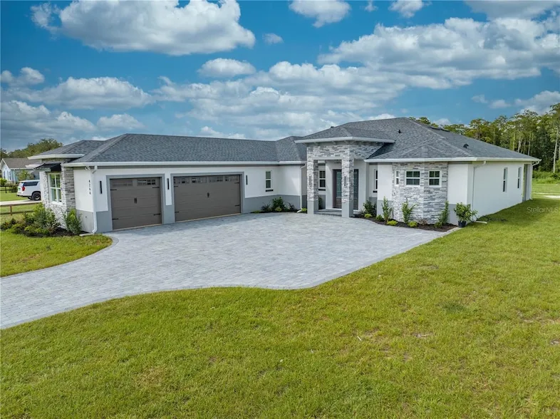 Brand New FOUR-bedroom, THREE and a half- bathroom dream home. This gorgeous home is situated on a 1.54-acre lot with a beautiful view of trees and wildlife. The great room encompasses your kitchen, dining room and living room with a built-in electric fireplace and matching cabinets with shelves for storage and d cor . This amazing kitchen features an island with breakfast bar, barn sink, gold fixtures, solid wood cabinets from counter to ceiling, a vented hood over the cook top, built in oven and microwave, a lazy Susan, beautiful backsplash that matches the quartz counters and gold finishes, and a hidden walk-in pantry with additional refrigerator, countertops and cabinets to match the kitchen. The entire house other than bathrooms have Luxury Vinyl Plank flooring, the bathrooms have porcelain tile. The floorplan is a 3-way split with one bedroom and bathroom on the rear south side of the house next to the laundry room which is also equipped with a laundry tub, on the opposite side of the house you will find the guest bedrooms and a large guest bathroom with dual sinks, and a center countertop cabinet that adds style and extra storage. The primary suite offers his and her walk-in closets with built in shelving, a stand-alone tub with separate shower stall, dual sinks, centered countertop cabinet and a separate water closet with a linen closet. Other excellent features include walk-in closets in ALL bedrooms, a mudroom area off the garage. The exterior features include rain gutters, a 3-car garage with additional storage closets, epoxy coated floors, and plenty of parking in the large driveway that also has pavers.