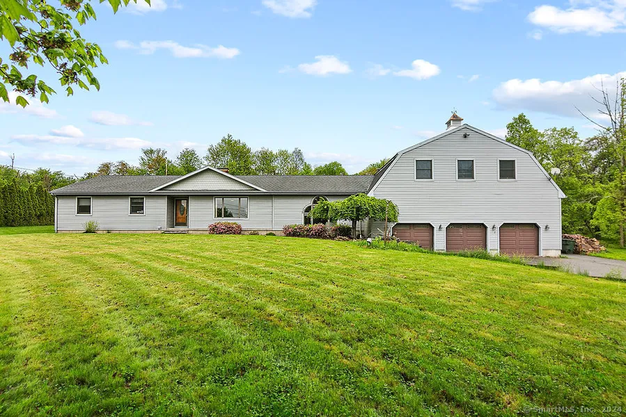 This expansive 5-bedroom ranch offers ample space for all, featuring a flexible layout set on 1.5 acres. It boasts a custom kitchen complete with granite countertops, stainless steel appliances, a Subzero refrigerator, pantry, breakfast bar, and island. The family room is flooded with sunlight and showcases a vaulted ceiling, a tailor-made built-in entertainment area, and a library. Laundry is conveniently located off the kitchen with half bath and pantry. The primary bedroom features walk-in closet with wall safe. Two additional bedrooms on this level, one with custom built-ins and a murphy bed for versatility. Sunroom off of the dining area has sliders to the rear yard with custom patio and garden area with over 3 dozen blueberry bushes. An electric awing, custom firepit and 32' Kloter Farms storage building round out your backyard oasis. The lower level is fully finished and includes a dry bar, a customized pool table, a sauna, two bedrooms, a full bathroom, and an extra office space. The garage features three bays, accommodating up to seven cars, and spans 40x40 feet. It's heated and equipped with custom cabinets, workbenches, air compressor, and a car lift. Whether you're a dedicated handyman or a passionate car aficionado, this garage is sure to fulfill your every need and desire. This amazing home also features a newer roof, Anderson windows, 2 heating systems w/ 8 zones, central air with updated condenser, and is wired for a generator.