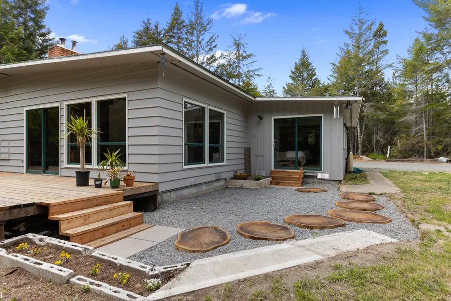 Just up the road from the village of Mendocino and the K-8 school lies fully fenced 1.55 acres and a contemporary residence with a mid-century vibe. This U-shaped single-story home is set in the light-splashed meadow surrounded by truly magnificent stands of redwoods, oaks, firs, manzanita and cypress. At the center of the home is a large dine-in kitchen separated by a brick wall and fireplace from a spacious living area. The left side of the home contains the 3 bedrooms and one of the baths, while the opposite side holds the 2nd bath, a laundry room and a 2-car garage. The high-pitched, redwood-clad ceilings and abundant glass bathes the living spaces in natural light from multiple angles.