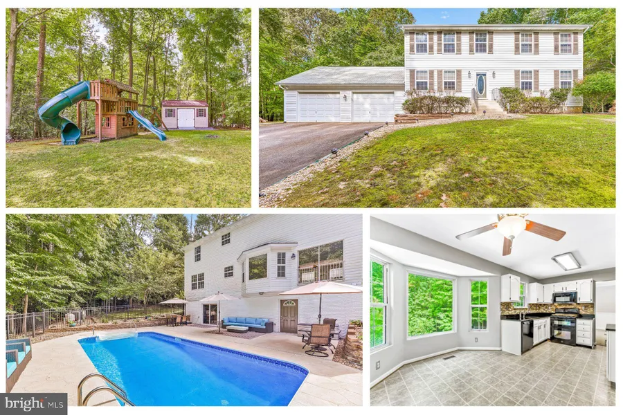 PRIVATE BACKYARD OASIS! 4 Bedrooms 2.5 Bath 2900 SQ FT Colonial with a HEATED POOL on a very secluded 1.56 Acre Lot!! Upon entering this Colonial you are greeted by a foyer with an oversized coat closet and gorgeous hardwood floors that flow into the main floor hallway. To the right is the formal living/flex room that can be utilized as a home office, library, or formal sitting area. Just behind the formal living room is the formal dining room boasting freshly painted walls paired with an elegant chair rail for added charm. The kitchen is equipped with plenty of cabinets for storage, updated appliances including a double oven, a tile backsplash and professionally refinished cabinets. The breakfast area has a gorgeous bay window that allows for views of the trees and provides plenty of natural lighting. Glass sliders give the opportunity to create an outdoor living area off the main level. Going upstairs, the primary bedroom offers ample space to hold a king size bed comfortably, a large walk-in closet, & an updated en-suite primary bathroom. Down the hallway you will find three additional bedrooms with large closets and an updated full bathroom to serve them. The basement is home to a massive rec room, a den/exercise room, & a large laundry/storage area. The full walkout basement allows access to the pool/patio area from both the laundry room & the rec room. The 16,000 gallon in-ground pool is surrounded by a massive concrete patio, hardscaping, & landscaping creating the perfect back yard oasis. The fence surrounding the pool has a gate creating easy access to the side yard with the playground and shaded grass area. New HVAC! This home has so much to offer! Set up a showing ASAP before its GONE!