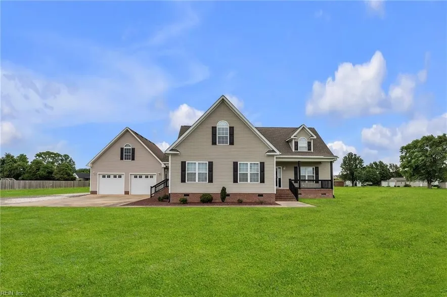 Beautifully set on 1.56 acres, this spacious home features a 30x28 oversized detached garage with an unfinished room above perfect for storage, a workshop, or future expansion. With no HOA and no flood insurance required, it s a rare find! The inviting Great Room offers a gas fireplace, while the kitchen shines with stainless steel appliances, ample cabinetry, and a breakfast bar. The dining area opens to a covered deck overlooking the expansive backyard ideal for relaxing or entertaining. The main level includes a primary suite with a private bath, two additional bedrooms, and a full bath. Upstairs, you'll find a fourth bedroom, two flex rooms, and another full bath perfect for guests, a home office, or a playroom. Conveniently located near the NC/VA line for an easy commute, 30 minutes to Elizabeth City, and under an hour to the OBX beaches. This home offers space, flexibility, and freedom schedule your showing today!