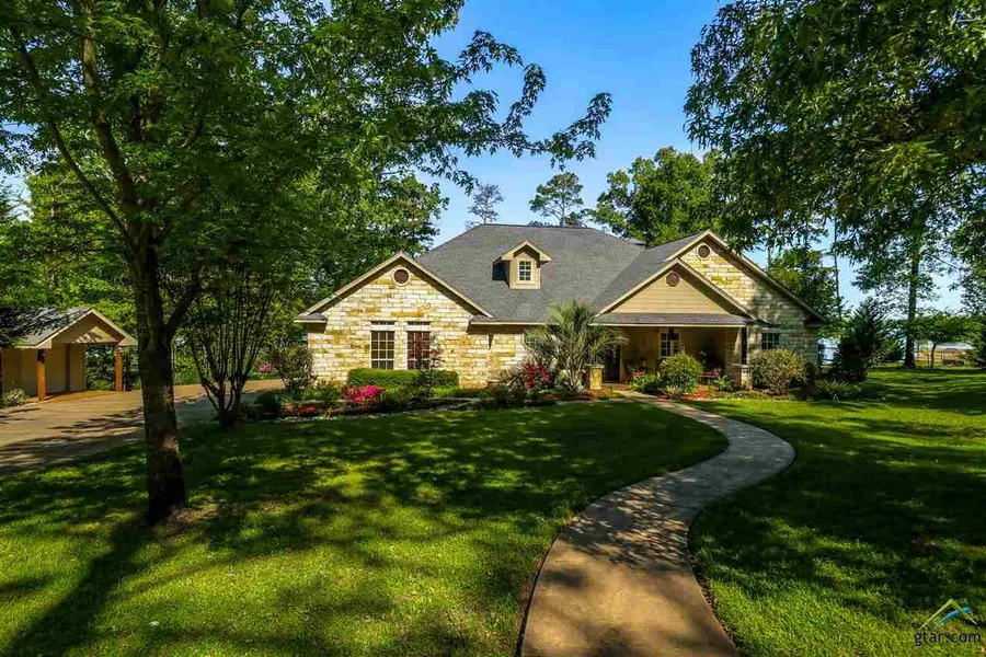 On Lake Time! Stunning Waterfront at Lake Bob Sandlin. Beautifully landscaped on 1.5 acres and 188 feet of Waterfront. Lakeside yard has plenty of shade and gentle slope down to very nice 2 stall boathouse. Covered back veranda with outdoor fireplace for Fall and Winter evenings and S'mores in the Summer. Detached guest house includes 2 car garage, living, kitchen, bedroom, bathroom, and a private patio with lake views, perfect for weekend guests. Detached Shed with overhead door matching the guest and main house used for additional storage. Circle drive, and ample parking. Main House features 3 bedroom 2 bath, 2 living areas, and an office. Large kitchen living combo with beautiful fireplace, soaring ceilings, and wall of windows to take in the views of the lake! Call today to schedule your showing of this remarkable property.