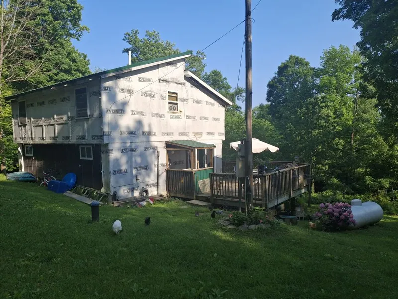 Homestead Dream Home. Check out this cottage style three bedroom, 1.2 bath home on a private road, partially wooded lot with a circular driveway. Enter from the side deck entry into a large open living/dining/country kitchen with an island area. Tall windows boast a 180 degree view of the Valley. Seller built a corner TV entertainment area. Laundry room is conveniently located downstairs. Off the kitchen and through the sliding glass doors there is a spacious deck overlooking the side yard gazebo firepit area. The stairwell going upstairs is wide. The hot water tank is located under the stairwell/storage area. Upstairs you will find three bedrooms. They are unfinished and waiting for your design expertise. The primary bedroom has vaulted ceilings with upper side sky light windows. The attic space allows for storage only. There is a room at the top of the stairs that hosts a toilet and a room that could be used for storage closet space. The propane tank is owned. There is a shed currently used for storage and chicken house. The lands are partially sloped with some flat areas perfect for gardens, the view at the back of the home is amazing. Seller is selling AS IS and will make no repairs. Showings will be held on Saturdays and Sundays only from 3 pm to 7 pm.