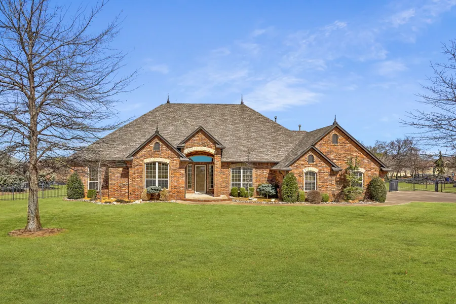 Sprawling suburban retreat with resort-style amenities in Tuttle Schools. Sitting on over one-and-a-half acres, this home offers spacious living with outdoor living & kitchen, saltwater pool, detached shop with 900 SF apartment, and gated drive. Entering the home, you'll find hardwood floors with rich wood trim, a living area with plantation shutters, statement stone fireplace with reclaimed wood mantle. Next you'll find an updated kitchen with granite counters, stainless steel appliances, custom cabinetry, and breakfast bar. Large master suite has tons of natural light and view of the lake. Attached ensuite has dual vanities, granite counters, soaker tub, and walk-in closet. Two Guest bedrooms share a Jack-and-Jill bathroom.Study is near kitchen but could be used as a 4th bedroom. Upstairs is a large bonus room and full media room with theater seating.The backyard is a dream with large outdoor kitchen and living area overlooking a saltwater pool and private lake. In the shop is a one-bedroom apartment with bedroom, living/kitchen, and full bathroom.