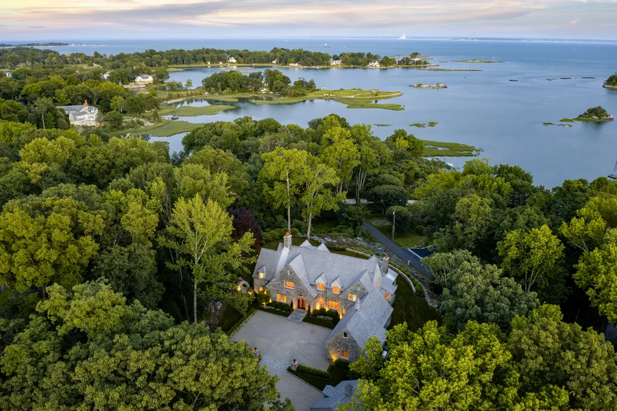 A rare opportunity to enjoy the beauty of coastal Darien in an exquisite and peaceful setting. Situated 60' above mean high water with stunning, panoramic, views of Scotts Cove and the Long Island Sound, this bespoke English Manor home, designed by Douglas VanderHorn Architects, was masterfully built with impeccable quality throughout. A sweeping driveway leads to this extraordinary stone home with mahogany French doors giving way to the breathtaking view beyond. With water views from every room, the home was designed to take advantage of one of the most unique settings in Darien. Comfortable living and entertaining spaces with custom details and millwork throughout, include a gracious living room/dining room, a spectacular chef's kitchen, and adjacent family room with stone fireplace, and cathedral ceiling with reclaimed oak trusses. A private guest suite, walnut paneled study, office, ...