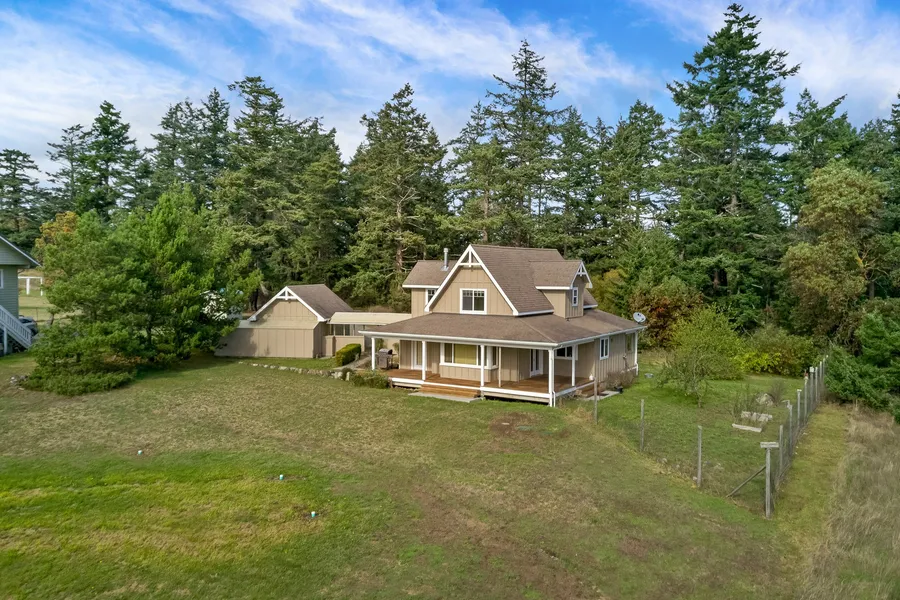 This classic Cape Cod style home is located in the quiet community of Portland Fair Estates. The 2-story 3 bedroom and 2 bathroom house sits on a 1.5 acre sunny and open lot with a fenced-in orchard and potential garden space. The kitchen offers ample storage space and has a breakfast bar, the open living and dining room area features a bay window, free standing propane stove and French doors leading to an expansive covered porch. The porch invites to relax and enjoy engaging scenic vistas over the southern end of San Juan Island to the Olympic Mountains beyond with peek-a-boo water views of Haro Strait. The master bedroom on the main level has its own bathroom, a walk-in closet and access to a small enclosed porch/sun room. The second story has two additional bedrooms and a bathroom with double sink vanity. The detached one car garage has a covered breezeway leading to the side entrance...