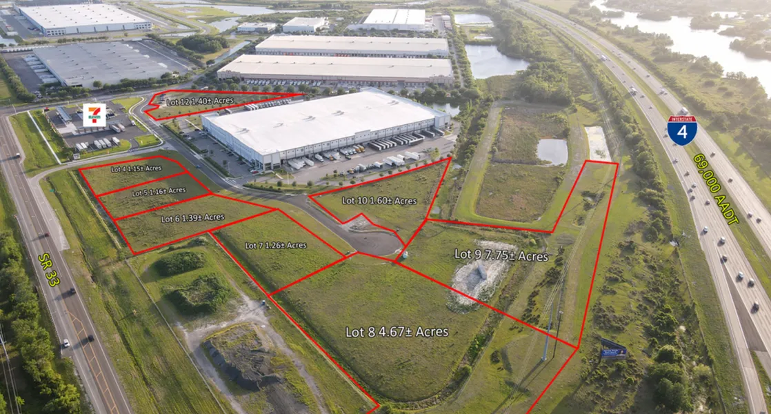 This offering includes cleared and filled pad-ready parcels ranging from 1 to 7.75 acres, situated along Firstpark Boulevard and fronting both I-4 and SR 33. Infrastructure is already in place with a master spine road, curb cuts, and off-site master retention completed. Each parcel includes a 50-trip count allocation, with additional trips available for ...