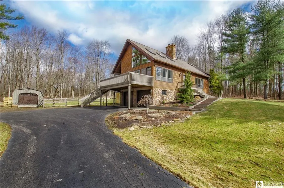 Turn down the private road, continue through the lush surroundings and arrive at what you could call home. This stunning property sits tucked amongst the trees on over an acre and a half. Secluded on all for sides this home is ideal for those looking for peace and quiet. It's proximity to I-86, Moonbrook CC, Chautauqua Lake and downtown Jamestown puts in the center of convenience. Step inside and you're greeted by soaring ceilings, tons of natural light, and the centerpiece of the home...it's massive stone fireplace. Surrounded by windows with only nature as your view, or look to the stars through the skylights. The living areas are spacious and comfortable. The kitchen has received a major update. There is laundry, pantry and half bath for convenience on main level. Master suite with soaking tub on the first floor. Access to hot tub and deck off the master as well. Three bedrooms and an additional bath can be found on the 2nd floor. The basement has a gym, workspace and plenty of dry storage. Enjoy the outdoors on the large deck, patio or partially fenced yard. Huge 14x32 shed with reinforced flooring. Showings begin 3/25. Delayed Negotiations until 3/30 at 5pm