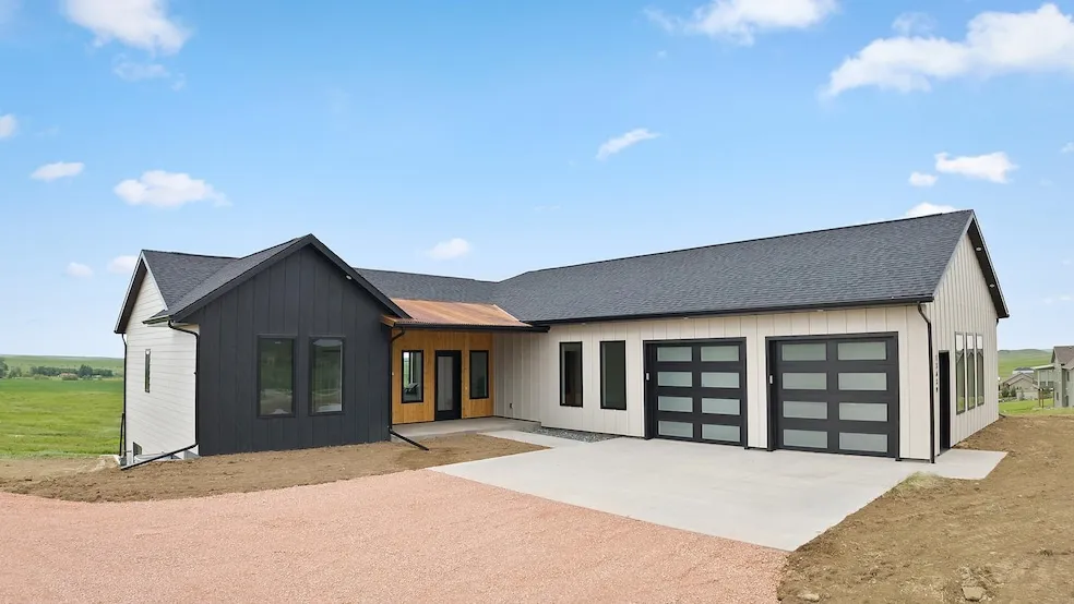 This striking new home blends sleek modern design with the peaceful beauty of the South Dakota hills and prairie. Just minutes from Rapid City, this custom-built residence features bold exterior finishes, a covered entry, and oversized windows framing panoramic views. Inside, you'll find an open-concept layout with vaulted ceilings, stunning accents, and a show-stopping kitchen. The space includes quartz countertops, a large island, custom cabinetry, walk-in pantry, and designer lighting all perfect for entertaining. The living and dining areas are lined with black-framed windows offering unobstructed views and natural light. The spacious primary suite includes a spa-like bath with dual sinks, LED-lit mirrors, matte black fixtures, and a tiled walk-in shower. Additional bedrooms and bathrooms maintain the same level of modern elegance. The finished walkout basement offers added living sp...