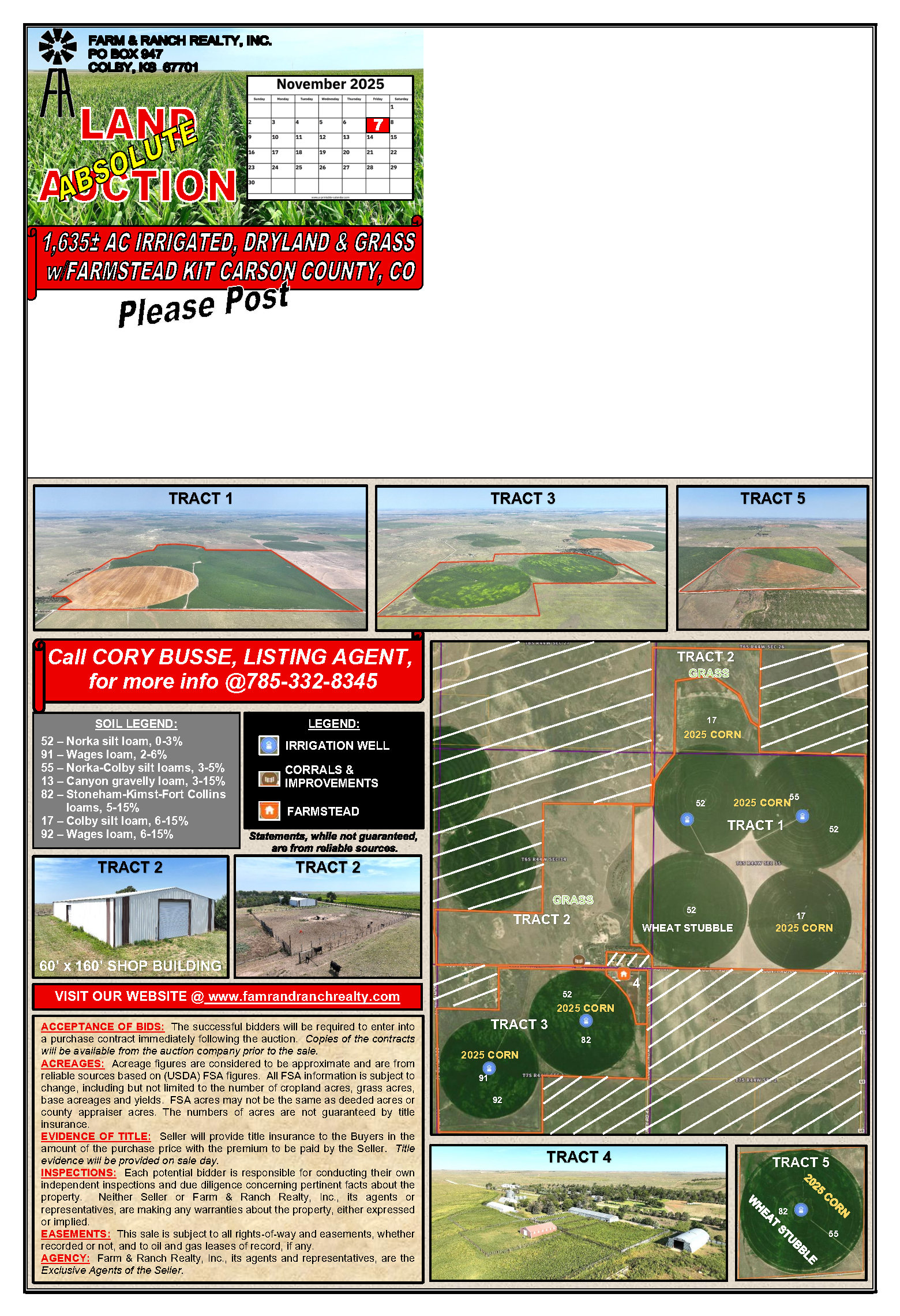 The land will sell in 5 tracts. TRACT 1 consists of 745 acres with 537 acres under pivot irrigation. There are 2 wells supplying a total of approximately 1,900 GPM. Each pivot is nozzled at 625 GPM. TRACT 2 consists of 376+ acres of grass with a gathering corral and a 60’x160’ pole style storage building. TRACT 3 has 235+ acres of irrigated land under 2 pivots. The west pivot is nozzled at 600 GPM and the east one at 500 GPM. TRACT 4 is an improvement site with 17.1+ acres. The improvements consist of a ranch-style home with 3 bedrooms and a 2-car attached garage. There are also several outbuildings for storage and livestock use along with corrals, feed pens and cement bunk lines. TRACT 5 is an irrigated quarter with an older 8-tower Lockwood sprinkler nozzled at 250 GPM. The pump is powered with a natural gas motor that stays with the land. This is an excellent offering of high-quality farmland. Don’t miss this opportunity to buy land in a productive area of Kit Carson County!