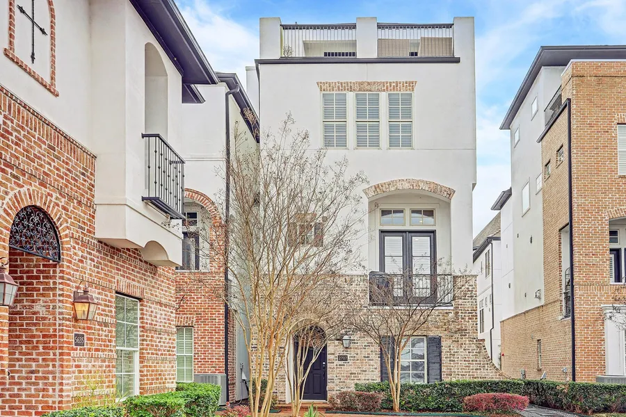 Beautiful free standing home in Cottage Grove nestled in a private gated community which includes a pool, lake, walking trails, and dog park. This spacious home features an open floorplan and high ceilings and one downstairs bedroom with en suite bath, a large kitchen with island on the second floor opening to the dining area and large living area with a balcony and half bath, a huge primary suite on the third floor with three closets, dual sinks, soaking tub and shower, and a third floor secondary bedroom with en suite bath. Plus, on the fourth floor there is a large game room (which could be another bedroom), full bath and another secondary bedroom/extra room. French doors off of the game room open to a rooftop deck offering a spectacular view of the Houston skyline. The home is ideally located at the back of the community with easy access for parking in the two car garage and for guest parking on Arabelle Street.