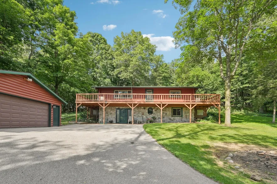 Relax on the wraparound deck of this private, secluded full-log home surrounded by a beautiful treetop canopy. The open-concept living room and kitchen feature custom hickory cabinets, Corian countertops, and a breakfast bar for four. Large windows invite fresh breezes and natural light, creating a true retreat feel. Don't miss your chance to own this peaceful getawayschedule your private showing today!