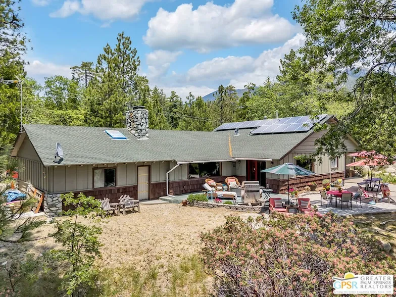 Scenic Solar-Powered Lodge. Just a short drive from town, this beautifully remodeled single-story lodge offers panoramic views and an ever-changing sky especially stunning when the clouds roll in. Powered by solar energy and fed by a well, this sustainable retreat blends modern design with rustic charm. Inside, large windows flood the space with natural light, highlighting hardwood floors, vaulted ceilings with exposed beams, and thoughtfully selected fixtures throughout. The open-concept living and dining areas are anchored by a striking floor-to-ceiling river rock fireplaceperfect for cozying up on cooler nights. Central heating ensures comfort year-round. The kitchen features stainless steel Bosch appliances, a sleek white tile backsplash, and granite countertopsideal for everyday living or entertaining. Each bedroom and bathroom offers unique touches, creating a warm, inviting feel throughout. The office/den features vaulted ceilings and a separate entrance to the outdoors, while the primary suite includes double glass doors opening to the backyard, wainscoting, and a charming knotty pine ceiling. Beyond the main lodge, the property boasts a separate, highly-rated glamping experience: a safari tent with its own private entrance, 3/4 bathroom, deck with BBQ, sink, and hot tub an ideal setup for guests or added income potential. Whether you're looking for a peaceful home, this exceptional lodge delivers. VA Loan is assumable per seller.