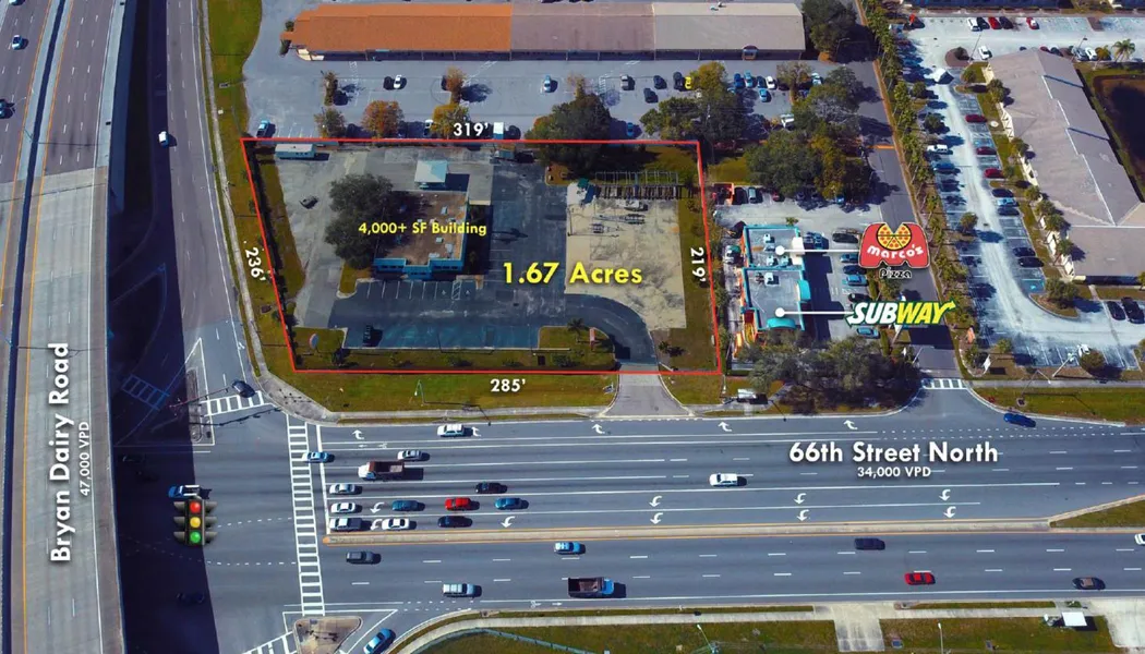 PROPERTY DESCRIPTION This 1.67-acre property is situated at the northwest corner of Bryan Dairy Road (47,500 vehicles per day) and North 66th Street (34,000 vehicles per day). The propertys central location allows for easy access from virtually anywhere in Pinellas County and is only a short drive from Tampa via I-275. The majority of the property is paved and includes a 4,000 plus square foot building that is in good position. Previously used as a boat dealership, this property would be ideal for similar uses or for commercial redevelopment. Buyers will be hard pressed to find another corner site of this size with favorable commercial zoning in all of Pinellas County.