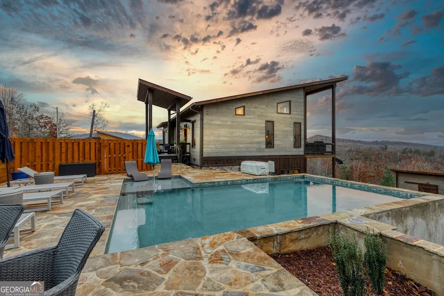 This luxurious Blue Ridge Mountain Escape offers unmatched features starting with a pristine and unique pool overlooking the mountain landscape, an element that immediately sets this property apart, along with an outdoor grill and a spacious backyard perfect for family fun; the expansive deck further enhances outdoor living with a fireplace, outdoor dining area, and a hot tub, allowing owners to sit in the hot tub or swim in the heated pool while watching the sunrise over the mountain range. Inside, the home boasts an open-concept modern-rustic kitchen and living space, complemented by a dedicated game room on the main level featuring a wet bar, wine cooler, fireplace, and pool table. The upper level hosts the King Suite with private deck access, mountain views, and a large walk-in bathroom with a classic standing tub and a wet-room style shower, plus a second bedroom also offering priva...