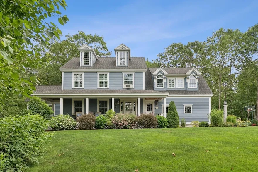 This stunning classic Colonial combines elegance with modern design. Beautifully landscaped grounds and an inviting front porch set the tone for this special home. Located in a quiet, friendly neighborhood, it provides exceptional privacy and ample parking, including three garage spaces, ideal for entertaining or large gatherings. The thoughtfully designed outdoor space features a private back patio, uniquely enclosed by the home and detached garage, creating a cozy, courtyard-like feel. Enter inside through a tiled mudroom with built-in storage, perfect for keeping life organized. The interior is designed with an exciting and versatile floor plan with plenty of room for guests, relaxation, and everyday living. Creating an inviting atmosphere the spacious eat-in kitchen opens into a grand living room with high cathedral ceilings and gleaming hardwood floors. A sunlit dining room with cathedral ceilings, gas fireplace, and wall-to-wall windows floods the space with natural light and provides direct access to the back patio. Convenience abounds with a first-floor laundry room and additional family room with a gas fireplace. The primary suite includes a full bath with double vanity and striking tiled shower, and three additional bedrooms on the second floor there's ample space for family or guests. The finished basement adds even more living space, with a recreation area that's excellent for games or exercise, a bar with seating, built-ins, and a private bedroom with a full bath. Adding to its appeal, the home offers direct access to the scenic Fuller Farm trails right from the back door. Enjoy excellent bird watching, and 2.6 miles of peaceful trails, it's a nature lover's dream. Ideally just 20 minutes from vibrant downtown Portland and only 15 minutes from Maine's renowned public beaches along the Atlantic coast, this home has comfort, style, convenience, and functionality in a beautiful, private setting; it's a must-see!