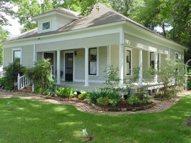 Picturesque Texas Farm House situated on corner lot. Living room, dining room, 2 bedrooms, bath, kitchen,& utility rm. Wraparound front porch & screened in back porch. Replaced well pump July 2014, NEW pump house. Stained glass dormer window. Vintage red Chambers stove, original red pine floors, claw-foot tub w/brass fittings, red brick walkways, red brick backyard patio. Landscaped yard with underground automatic sprinkler system. Native pecan & black walnut trees plus a small peach orchard. Crepe myrtles, red buds, cherry laurels, azaleas, hydrangeas,& 10 varieties of iris. Suitable for vegetable gardening & cultivation of figs, blue/blackberries,& grapes. Stove & some furnishings are negotiable. $6,000 Allowance given to buyer at closing for HVAC. Acreage to be determined by survey which seller is having done now. $6,000 Allowance given to buyer at closing for HVAC.