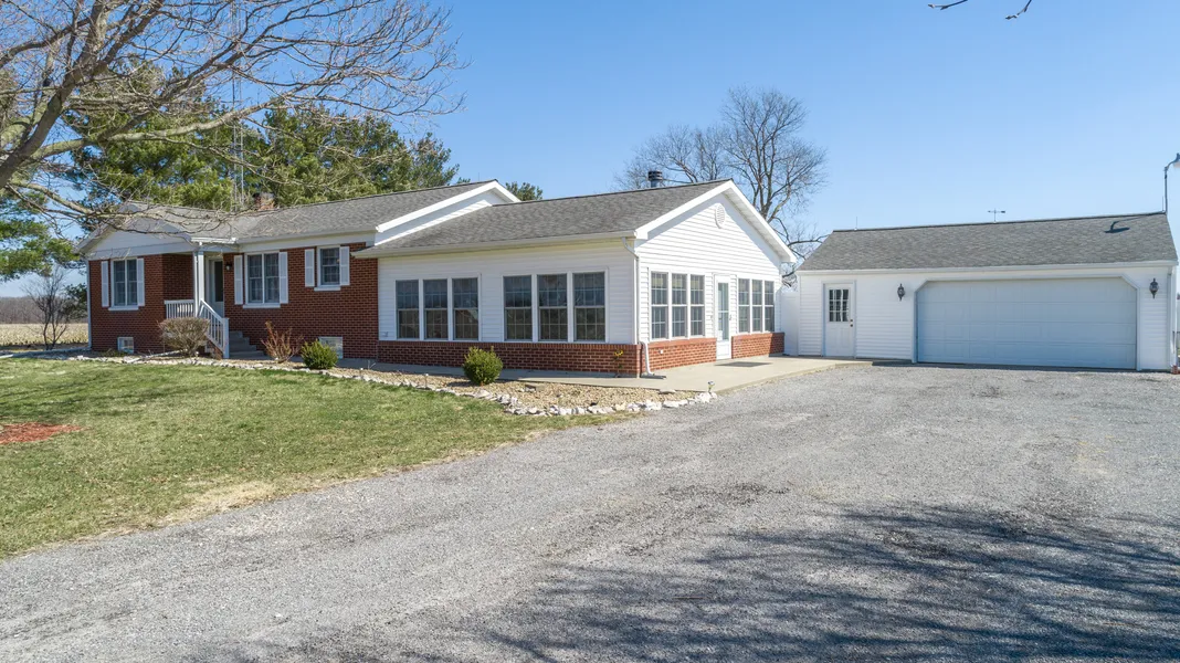 LOVELY HOUSE ON THE PRAIRIE! Country views abound in this 3 bedroom 2 bath move-in ready home on 1.7 acres. Bright and sunny living room with fireplace that can be either wood burning or gas. Kitchen and dining area feature oak cabinetry and flooring. Master suite includes its own bathroom with a tiled shower. Home also has solid oak doors and trim throughout. Basement has a finished room that could be used as a guest bedroom, office, playroom, etc. Outside, enjoy the fenced patio with a Sun-seeker electrical awning. There will be no lack of storage with the 2+ car garage, shed and 48x80 metal outbuilding that also has income potential. Well maintained brick and vinyl exterior along with tasteful landscaping are the finishing touches youve been looking for. Heres your chance for your own peaceful paradise!