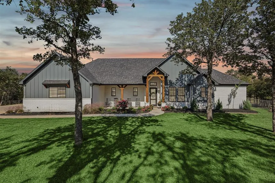 1% TEMPORARY RATE BUYDOWN WITH PREFERRED LENDER! Discover your dream country retreat in this stunning 4-bedroom home with an office, nestled on a lush 1.7-acre lot. Tucked away on a quiet cul-de-sac, this property provides the perfect mix of seclusion and peaceful living. Inside, you’ll find soaring vaulted ceilings with striking wood beams, flowing into a spacious kitchen designed for hosting gatherings. Step out to the expansive covered back porch, where an upgraded patio and cozy fireplace create the ideal space to relax while enjoying views of your own private pond! The generously sized bedrooms offer comfort, and the dedicated office is perfect for remote work. A thoughtfully converted third garage provides extra storage or flexible living space. Enjoy luxury touches like engineered hardwood flooring, quartz countertops and designer lighting. Your security is enhanced with a custom pipe no-climb fence around the entire property and enclosing a fully fenced immediate backyard—ideal for pets or children. This energy-efficient home also features spray foam insulation, keeping utility costs low. With no HOA and livestock allowed, this move-in ready home offers the freedom to embrace country living at its finest!