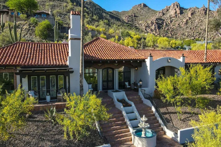 Charm & beauty encompass this extraordinary modern Spanish hacienda perched on an elevated 1.7 acre lot providing captivating city lights, serene desert & Mountain View's offering a radiant carefree lifestyle in Carefree, AZ! Extensive major improvements made by current owners since acquisition. Coffered & beamed ceilings along with a ornate chandelier give this home its distinct allure upon entry! Chef's kitchen complete with top of the line appliances and an enormous waterfall quartz island perfect for entertaining guests! Split owners suite with fireplace & balcony along with three generous sized guest bedrooms all en-suite. Maintenance free backyard with pool, gazebo and Michael Phelps 15ft swim spa is enclosed for complete sun bathing privacy!