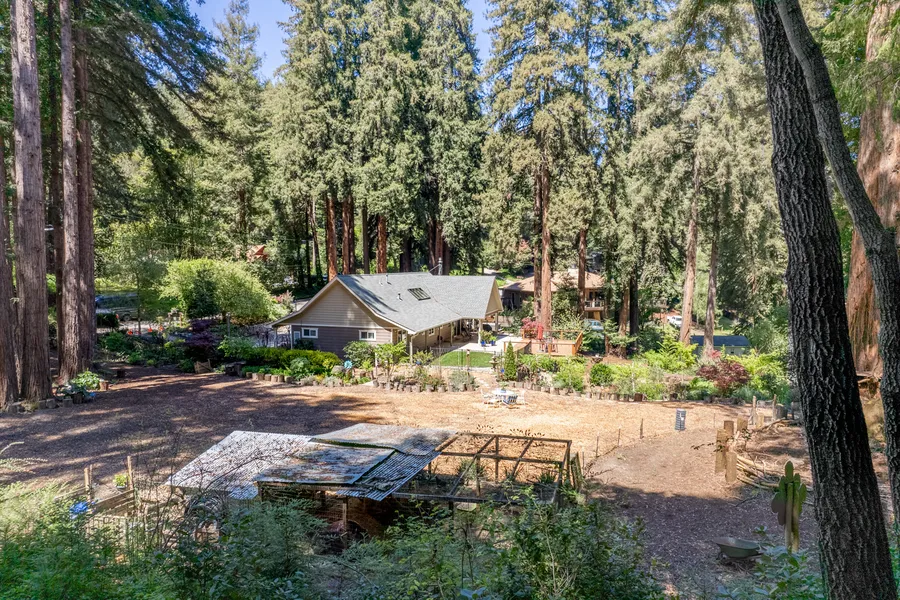 Wonderful single level home in a private close in Felton location on 1.73 acres-very useable! Spacious open floor plan in living/kitchen and dining rooms have up to 25 ft ceilings. Custom fans, lighting. Gas fireplace, separate level for dining. Newer cabinets/granite in kitchen with stainless appliances-large island. Laminate in living room and hardwood throughout. Hall bath just remodeled-new cabinet-counter-faucets and tile surround. Step out onto covered patio with recessed lighting, wired for sound and spa to left of gate will stay. Outdoor Shower. Nice extended view deck over grounds and lawn area are fenced. Wonderfully landscaped with several areas to enjoy entertaining. Cute little egg house out front for free eggs to the neighbors. Large portion of lot is level (Horses?) Separate Goat house and chicken coop. Goat house could be a playhouse for kids. Gate beyond driveway can house RV, boat, tractors, etc. 2 car garage with 1/2 bath, and laundry hookups-loads of stand up space attic above garage for more storage or ?? Leveled and rolled DG parking area-canvas covered carport for extra car. Off street parking for several more. Shed down below carport for extra storage. Easy walk into the friendly town of Felton and close to Henry Cowell entrance for hiking & enjoying nature.