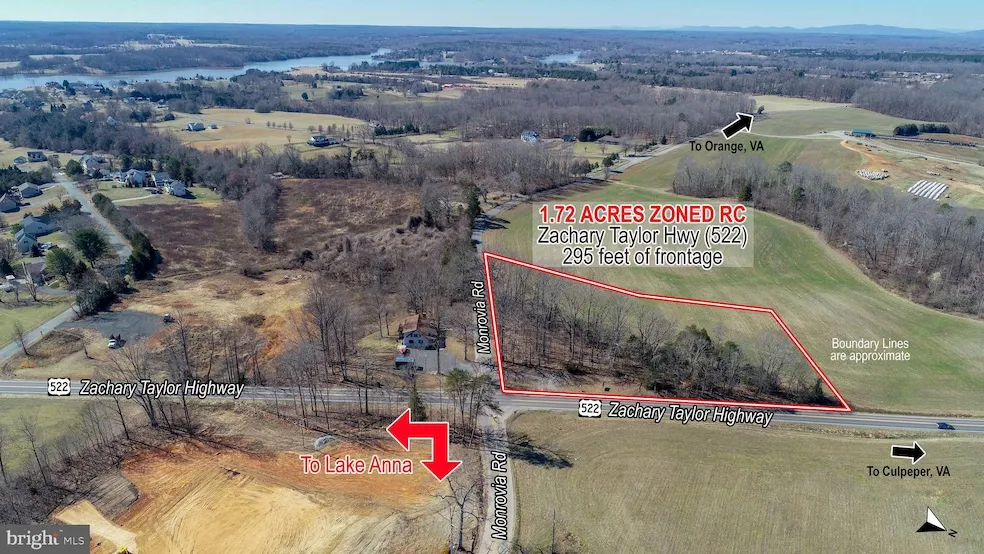 NEW PRICE! Here is your opportunity to purchase HIGHLY DESIRED COMMERCIAL PROPERTY minutes to Lake Anna on the Public Side at a fabulous price!!! What a great location at the intersection of Rt. 522 (Zachary Taylor Highway) and Rt. 612 Monrovia Road), with two convenient entrances on both roads, catacorner to the new Dollar General being constructed now and close to Tim's and The Cove Restaurants. This sale consists of 2 Tax Parcels: 53-1-4 (.63 acres) and 53-A-2A (1.09 acres), a total of 1.72 Acres, Zoned RC - Resort Commercial with a variety of permitted uses. The Lake Anna area is growing fast, and this is your chance to be among the many new businesses enhancing the Lake experience!