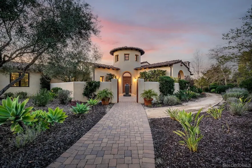 Welcome to 7552 Montien Road, a refined single-story estate built in 2014 by Mulvey Custom Builders and located in the prestigious guard-gated community of Santaluz. Designed to blur the line between indoors and out, this residence invites both effortless entertaining and quiet retreat. Through a serene entry courtyard, you ll find a flowing open plan with soaring wood-beamed ceilings, travertine floors, and curated designer finishes.