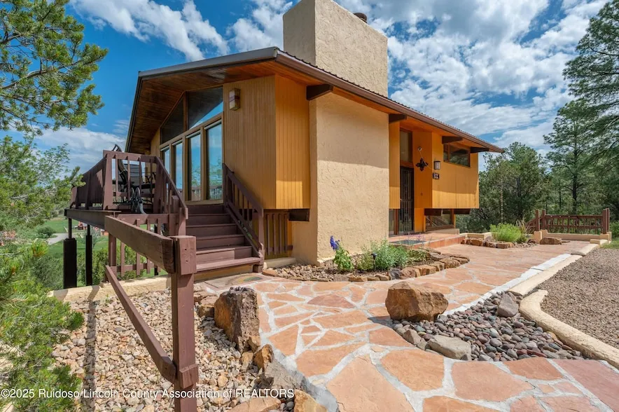 Expansive Sierra Blanca Views with Wonderful Mid-Century Charm - This fully furnished 3 BD 2 BA property captures the essence of timeless design and modern comfort. Property features a large 1.75 acre corner lot, multiple decks with inviting sitting areas & breathtaking views. Highlights include vaulted ceilings, abundant natural light, 2 fireplaces, dog run, A/C and 2 car garage.