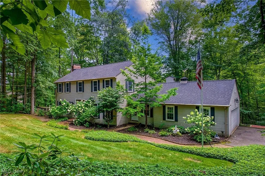 Welcome to this stunning Colonial in the desirable Yellow Creek Woods of Bath Township, perfectly nestled in the woods on a quiet cul-de-sac. This beautifully updated home offers a warm blend of charm, modern upgrades, and breathtaking nature views. Step into the open foyer where you ll find a formal living room to the left, complete with built-in bookcases, cozy fireplace, and double doors leading to the back deck. To the right, the dining room is a design lover s dream with vibrant wallpaper and a statement light fixture. The back of the home showcases an expansive open-concept great room featuring a brand-new remodeled kitchen (2025) with stainless steel appliances, side-by-side refrigerator, induction range, built-in microwave, and an oversized island seating nine. The kitchen flows seamlessly into the family room with a beamed vaulted ceiling, fireplace, and two sets of double doors opening to a wrap-around deck with serene wooded views. There is also a butler's pantry off the kitchen and a room that would make a perfect home office, which could also be converted to a first floor laundry. Upstairs, you ll find four bedrooms, including a primary suite with his-and-hers closets and an updated bathroom with a walk-in shower. One bedroom has been transformed into a luxury California Closet but can easily be converted back. New carpeting throughout the second floor adds comfort and style. The finished walkout basement offers additional living space with patio access, perfect for a recreation area or in-law suite. There is a fenced side yard, roof replaced in 2022, and Davis-serviced water softener system complete this exceptional property. Experience the privacy, luxury, and beauty this Bath Township home has to offer!